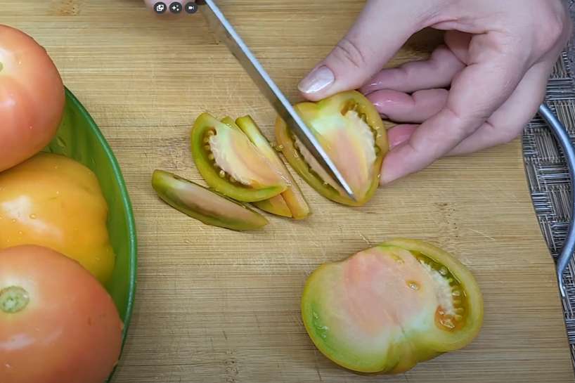 1. Zaļos tomātus rūpīgi nomazgā un sagriež šķēlītēs vai ripiņās.