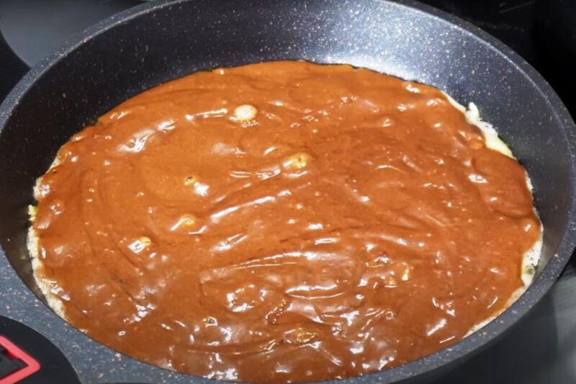 Bļodā sakuļ olu ar 100 g cukura, pievieno pienu, eļļu un šķipsniņu sāls. Pēc tam pievieno izsijātus miltus un kakao, samaisi līdz gludai, nedaudz biezai mīklai. Beigās iemaisi sodu, ko var nedaudz “apdzēst” ar pāris pilieniem etiķa vai citrona sulas.