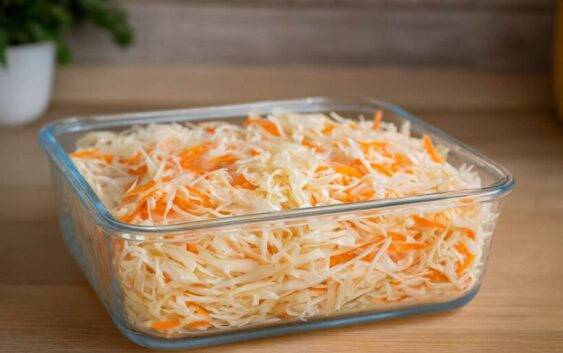 Kāpostus sīki sagrieziet vai sašķēlējiet ar mandolīnas rīvi. Burkānus sarīvējiet uz rupjās rīves. Sajauciet kopā un lieciet stikla burkā vai traukā ar vāku.