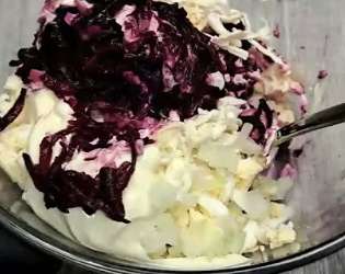 Bietes turpretim labāk rīvēt uz rupjās rīves. Tādā veidā tās neatsulosies tik ļoti un salātos būs jūtama to struktūra. Kad dārzeņi un olas ir sarīvēti, lieciet tos visus lielā bļodā.