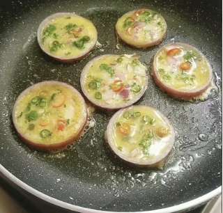 Uzkarsēju pannu ar pavisam nedaudz eļļas. Uzlieku uz tās sagatavotos sīpolu gredzenus – lielākos pa vidu, mazākos apkārt. Katrā gredzenā ieleju pāris karotes olu un dārzeņu maisījuma. Nav jāuztraucas, ja nedaudz izlīst pāri malām – to pēc tam var viegli noņemt.