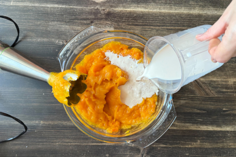 Uzmanīgi – neapdedzinieties! Ja blendera nav, var izmantot kartupeļu stampu. Bet ar blenderi, protams, būs ātrāk un labāk.