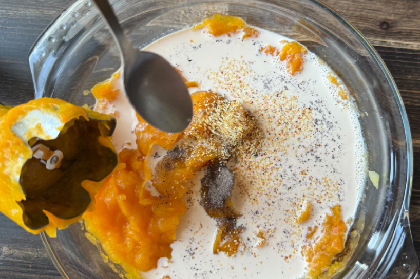 Un tūlīt pievienojam arī garšvielas, jo mēs taču dārzeņus nesālījām pirms gatavošanas. Es lietoju sāli, parastos maltos melnos piparus, kaltētu ķiploku un mazliet muskatrieksta. Tos iesaku, bet varat pievienot arī citas savas mīļākās garšvielas. Piemēram, bieži esmu redzējusi, ka ķirbju zupai liek kurkumu.