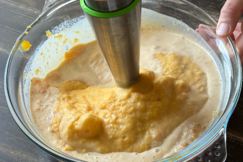 Aromāts kāds, mmm! Tagad ņemam rokas blenderi (ar asmeņu uzgali) un sablendējam dārzeņus līdz biezeņa konsistencei.
