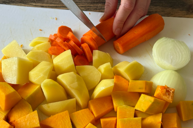 Paņemam burkānu, kartupeli un sīpolu, nomizojam un sagriežam nelielos gabaliņos: