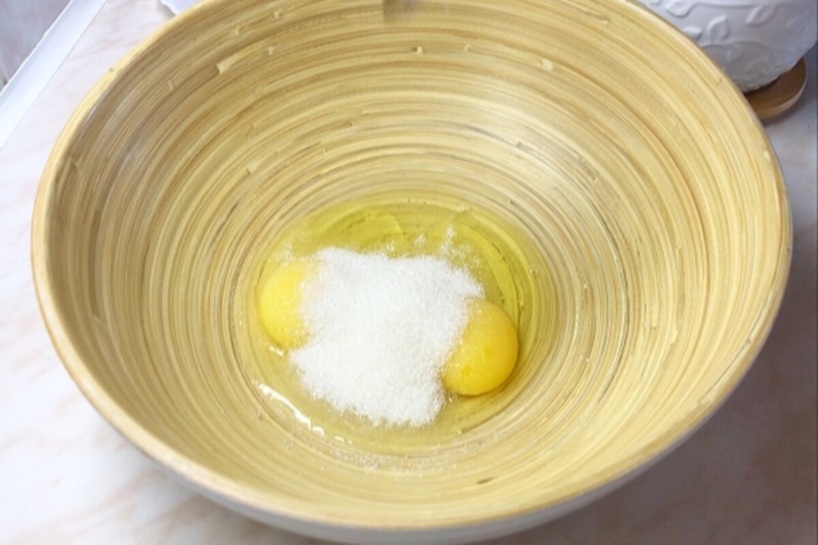 Bļodā sakuļ olas ar šķipsniņu sāls un cukuru, līdz masa kļūst viendabīga. Pievieno mīkstu sviestu un samaisi, līdz iegūsti krēmīgu konsistenci. Atsevišķā traukā sajauc miltus ar cepamo pulveri un pakāpeniski pievieno tos olu maisījumam, līdz izveidojas mīksta, bet bieza mīkla.