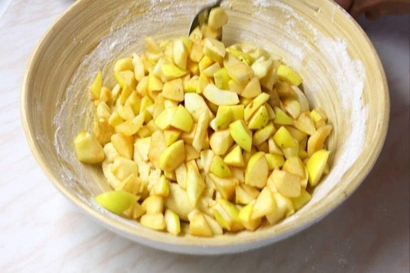 Nomazgā ābolus un sagriez tos nelielos gabaliņos — mizot nav obligāti, jo tieši mizā slēpjas patīkams aromāts un neliels skābums, kas cepumiem dod svaigumu. Ābolu gabaliņus iemaisi mīklā un viegli samaisi ar karoti, lai tie vienmērīgi sadalītos.