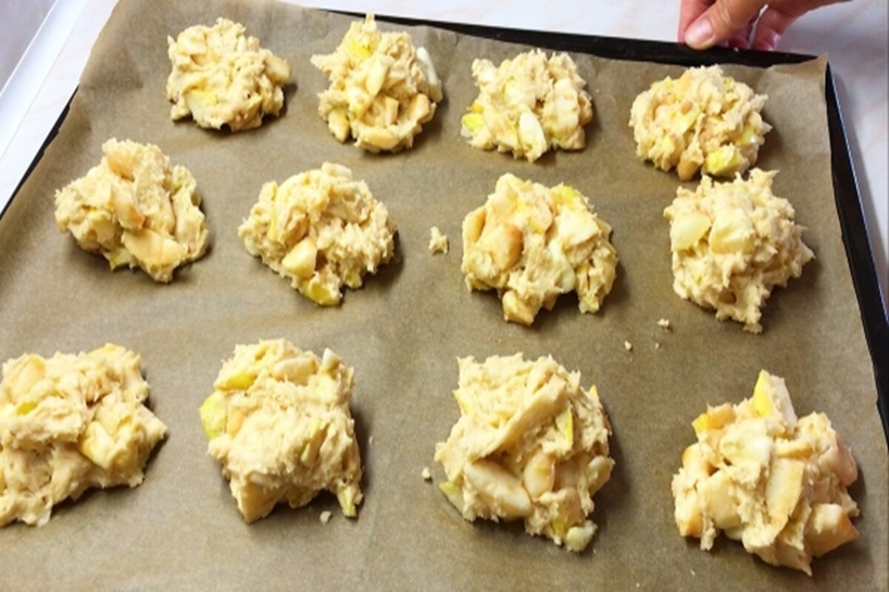 Izklāj cepešpannu ar cepamo papīru un ar karoti liec uz tās nelielas mīklas porcijas. Cep 170°C aptuveni 20 minūtes, pēc tam paaugstini temperatūru līdz 180°C un cep vēl 15–20 minūtes, līdz cepumi kļūst zeltaini un virtuvē jūtams ābolu un vaniļas aromāts.