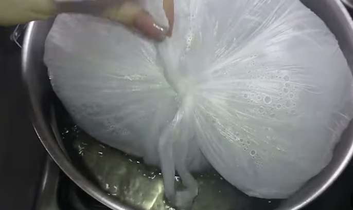 Ļaujiet tam atdzist katliņā 2 līdz 3 stundas, pēc tam izņemiet no maisiņa, ierīvējiet ar maltiem melnajiem pipariem un izspiestu ķiploku. Ietiniet pārtikas plēvē un ievietojiet ledusskapī uz 10 līdz 12 stundām.