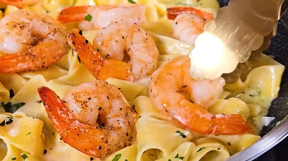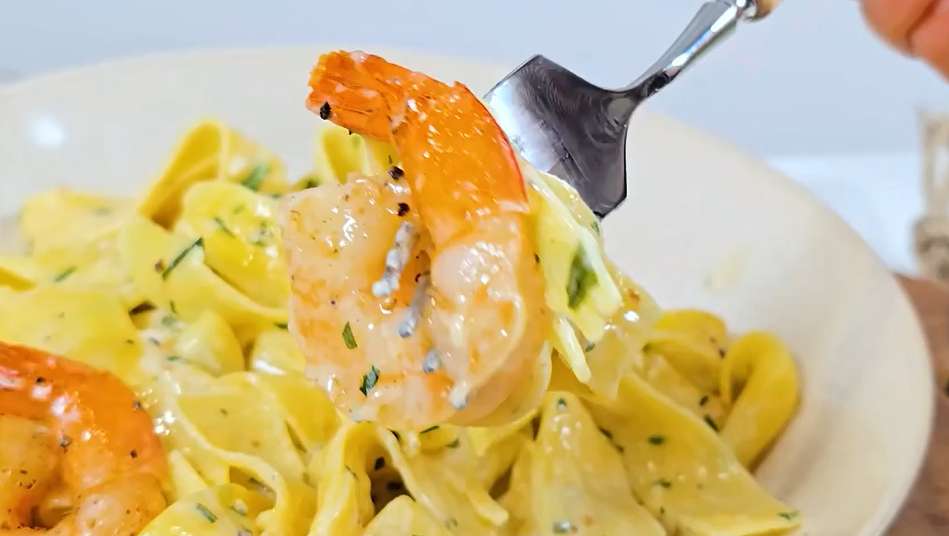 Maiga, svaigi vārīta pasta, sulīgas garneles un biezs, krēmīgs mērces slānis ar maigu ķiploka aromātu — viss, kas vajadzīgs, lai radītu sajūtu kā restorānā, neizejot no mājām.