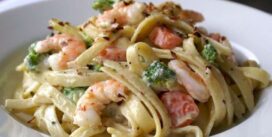Makaroni ar garnelēm krēmīgā mērcē – pusdienas, kas gatavas pusstundas laikā