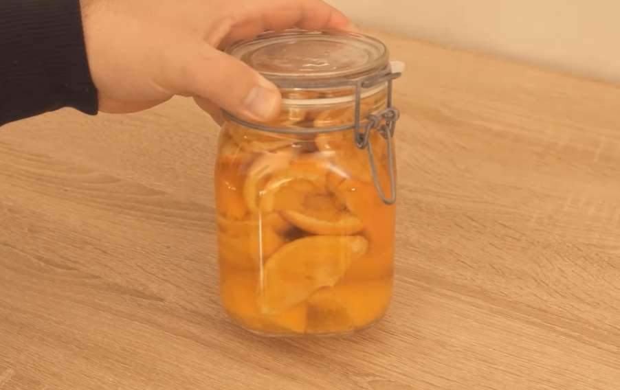 Periodiski sakratiet burku. Pēc dažām dienām šķidrums kļūs oranžs un iegūs citrusaugļu aromātu. Pēc tam izkāsiet uzlējumu caur sietu.