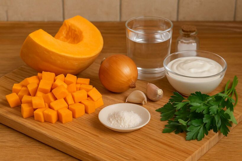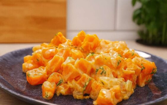 Uz galda nonāk spilgti oranži ķirbja gabaliņi maigā krēmīgā mērcē ar ķiploka aromātu. Virspusē uzkaisiet svaigi sakapātu pētersīli – tas piešķirs svaigumu un vizuālu skaistumu. Šis ēdiens lieliski garšo gan ar maizi, gan kā garnējums gaļai vai zivij, bet to var baudīt arī kā patstāvīgu vakariņu ēdienu.