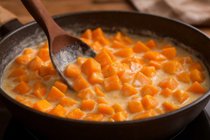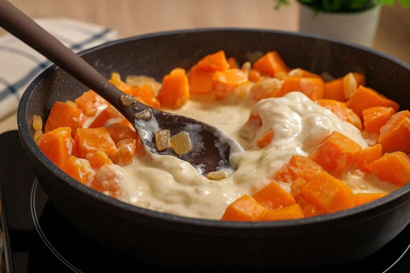 Pievieno krējumu un ūdeni, labi izmaisi. Uz mazas uguns sautē vēl 5–10 minūtes, līdz ķirbis kļūst mīksts.