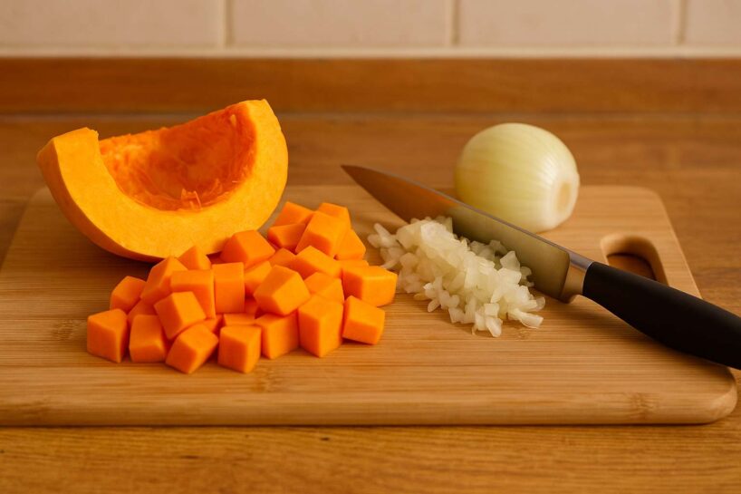 Ķirbi nomizo, izņem sēklas un sagriež vidēja izmēra kubiņos. Sīpolu smalki sakapā.