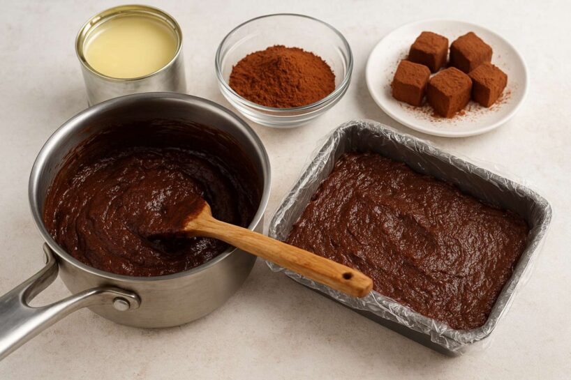 Kakao var būt vajadzīgs vairāk vai mazāk – tas atkarīgs no iebiezinātā piena kvalitātes. Man šodien pietika ar 70 gramiem kakao pulvera. Paņemam piemērotu formu, izklājam to ar pārtikas plēvi, liekam iekšā iegūto masu, izlīdzinām, aizveram ar plēvi un ievietojam ledusskapī līdz pilnīgai atdzišanai, bet vislabāk – uz nakti.