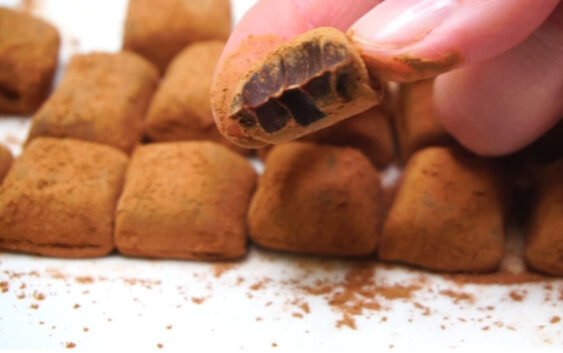 Tagad izņemam un sagriežam gabaliņos. Es šodien izņēmu un sagriezu jau pēc 2 stundām ledusskapī, tāpēc konfektes nedaudz lipa pie naža. Tad konfektes apviļājam kakao pulverī.
