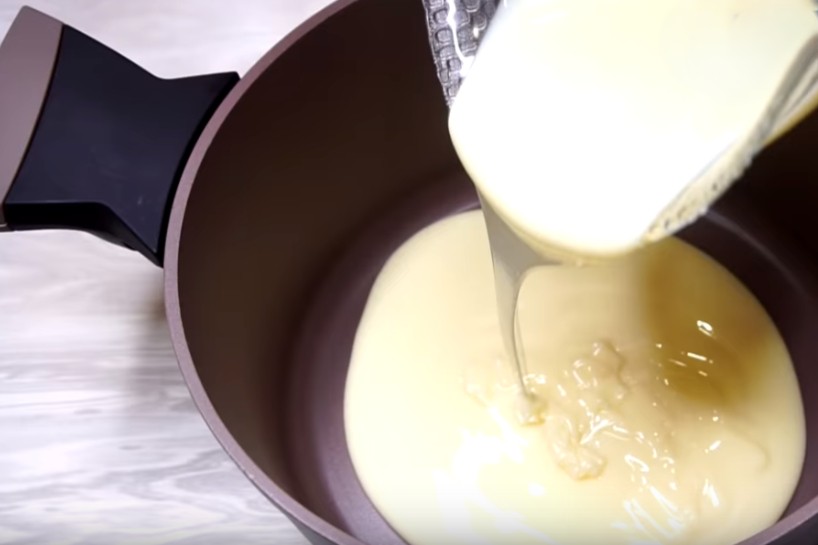 Paņemam 1 bundžu iebiezinātā piena, man svars bija 380 grami. Pārlejam to katliņā un liekam uz uguns, nepieciešams iebiezināto pienu uzvārīt.
