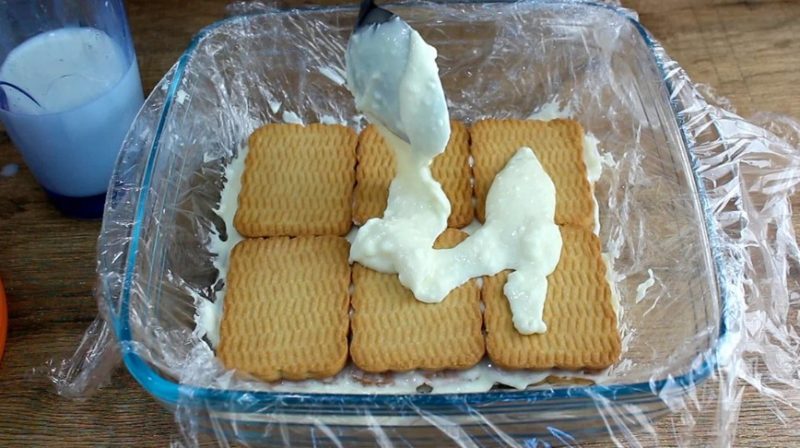 Pagatavošana ir ļoti vienkārša. Bļodā sajauc biezpienu, krēmsieru un iebiezināto pienu, līdz iegūsti maigu un viendabīgu krēmu. To var izdarīt ar karoti vai lāpstiņu — nav vajadzīgs ne mikseris, ne blenderis. Sagatavo formu un izklāj to ar pārtikas plēvi. Uz apakšas uzklāj nedaudz krēma, tad katru cepumu īsi iemērc pienā un kārto formā. Kad pirmais slānis gatavs, pārklāj to ar krēmu un turpini tādā pašā secībā — cepumi, krēms, cepumi.