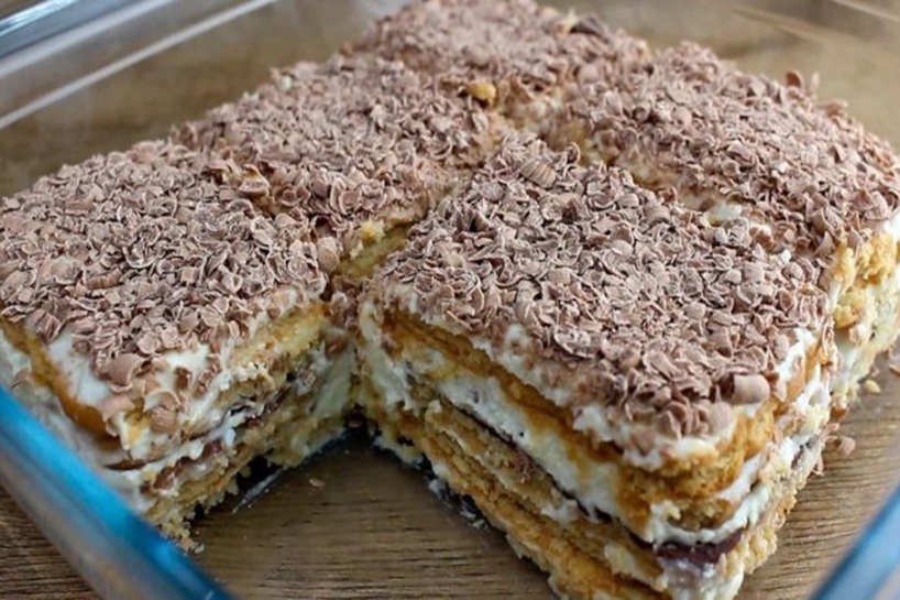 Cepumus iemērc tikai uz īsu brīdi — pietiks ar vienu sekundi, lai tie kļūtu mīksti, bet nesadalītos. Torte kļūst vēl gardāka nākamajā dienā, kad garšas savelkas un krēms pilnībā iesūcas cepumos. Ja vēlies šokolādes versiju, krēmam pievieno karoti kakao pulvera un nedaudz pārkaisi ar to arī virsu — garša būs vēl bagātīgāka.